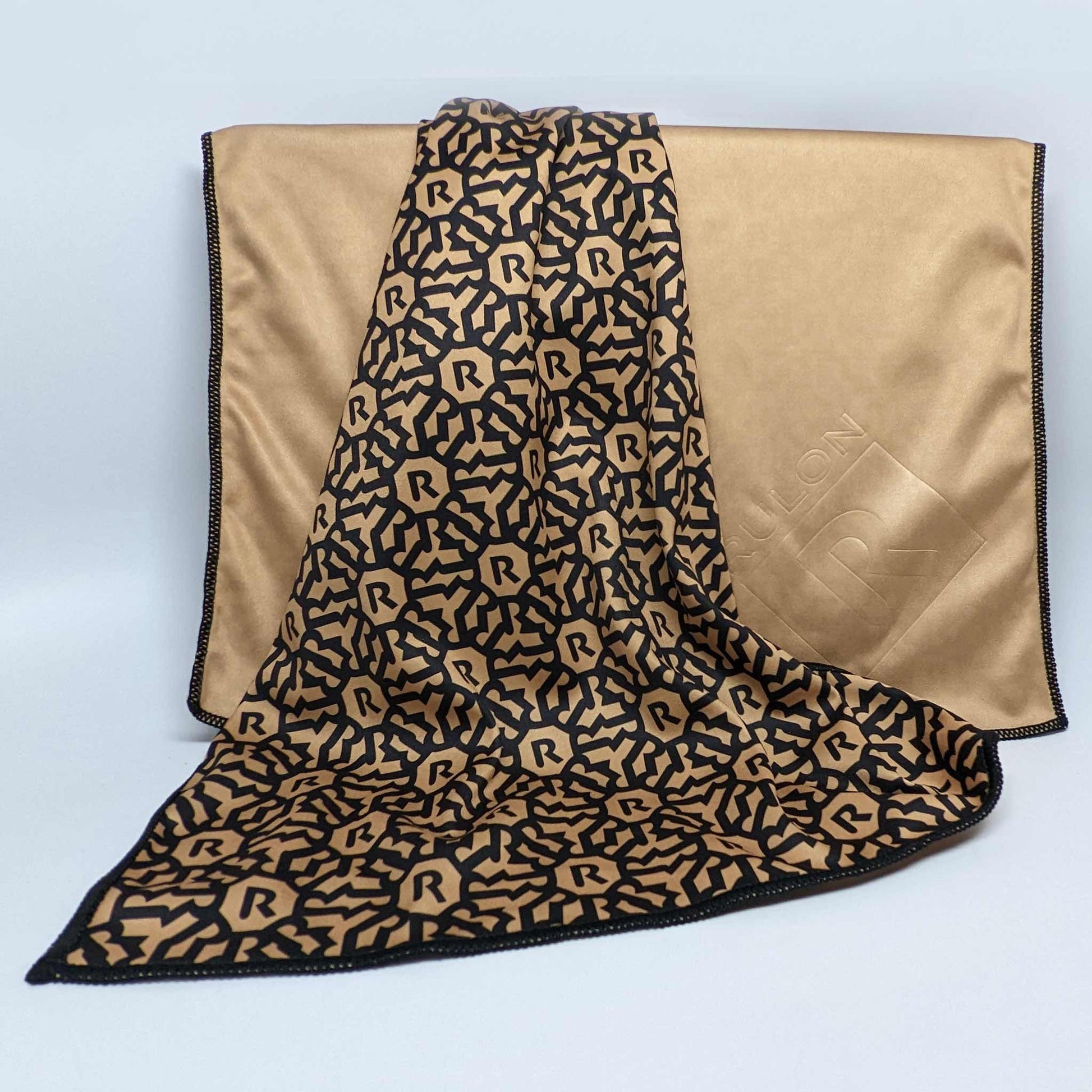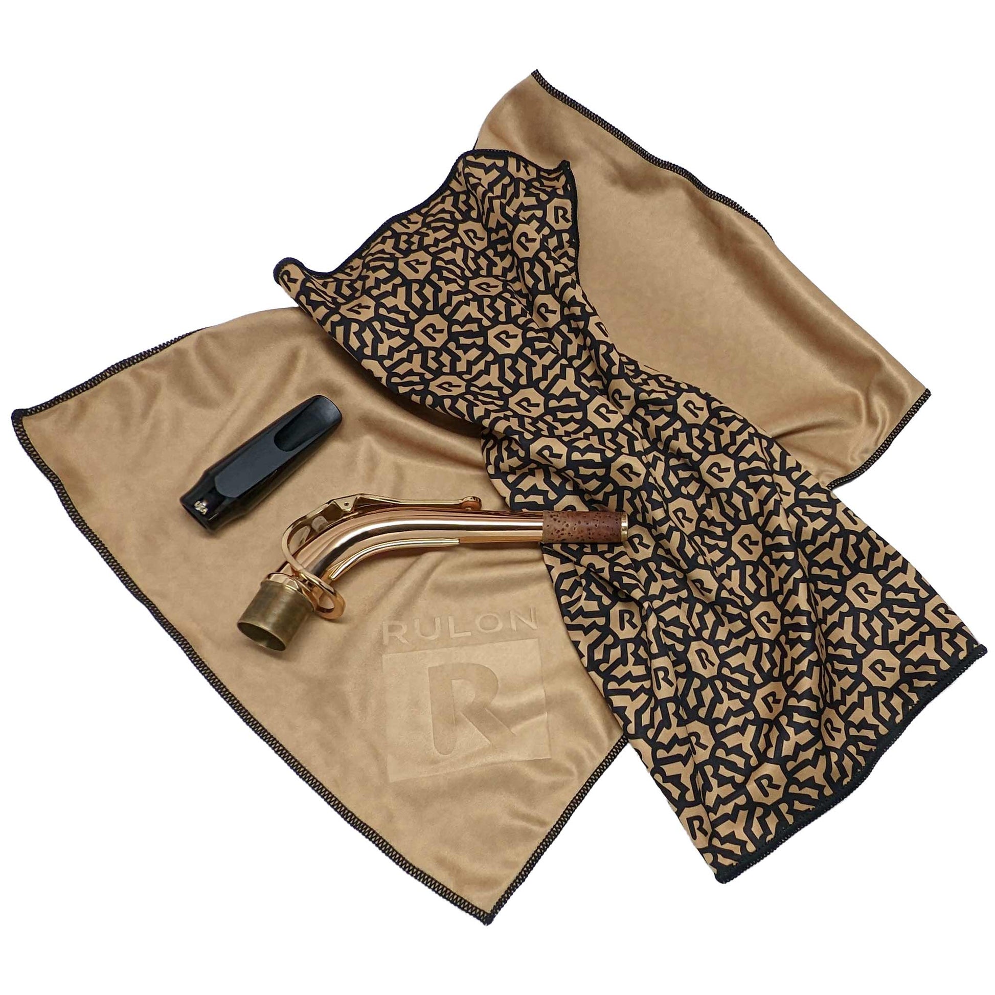 Look as good as you sound with this RULON fashion print cleaning cloth for musical instruments. The design features an interlocking R pattern in lush gold tones, elegant edge sewing, and a solid gold back with emboss RULON logo. The ultra-soft fabric is safe for cleaning all instrument finishes.