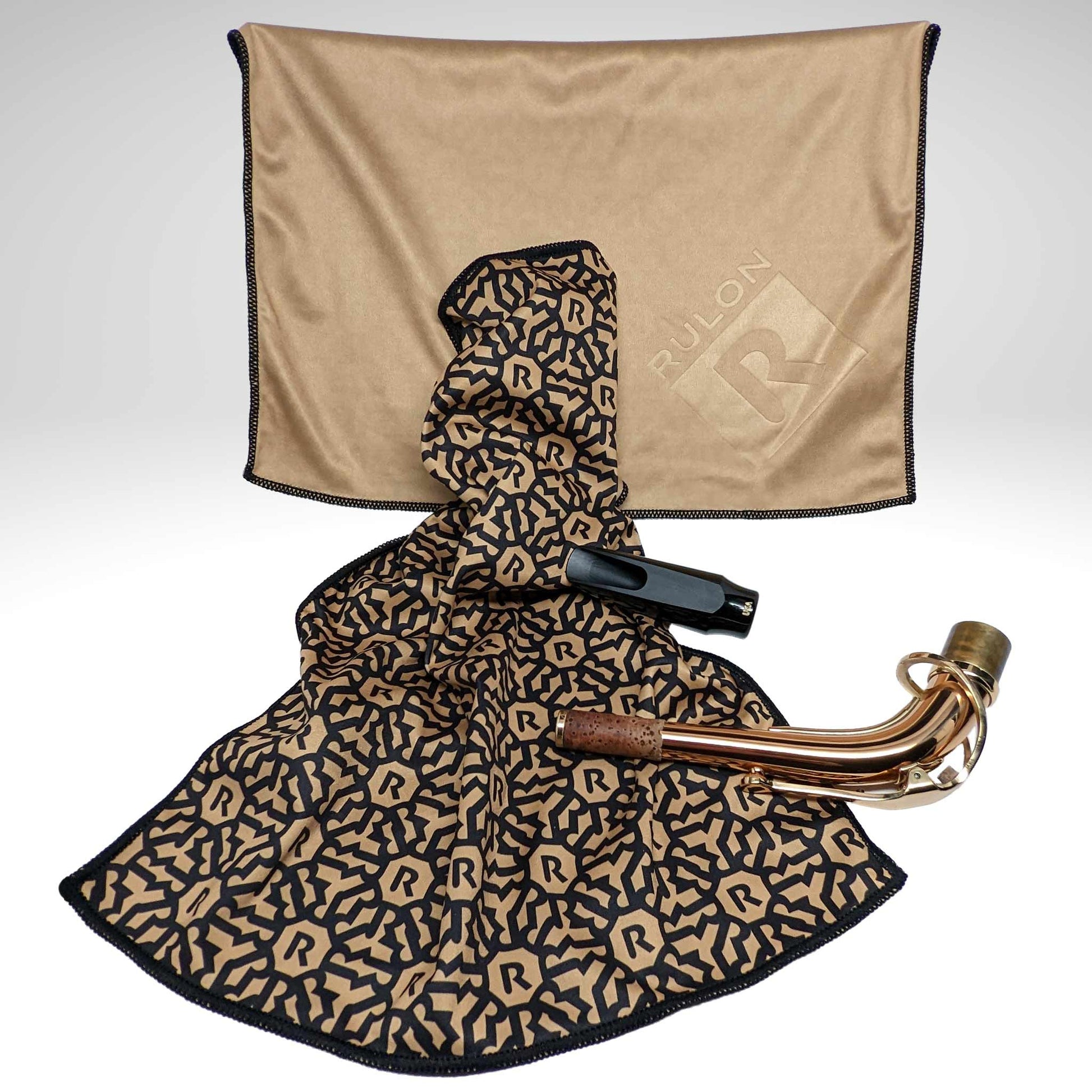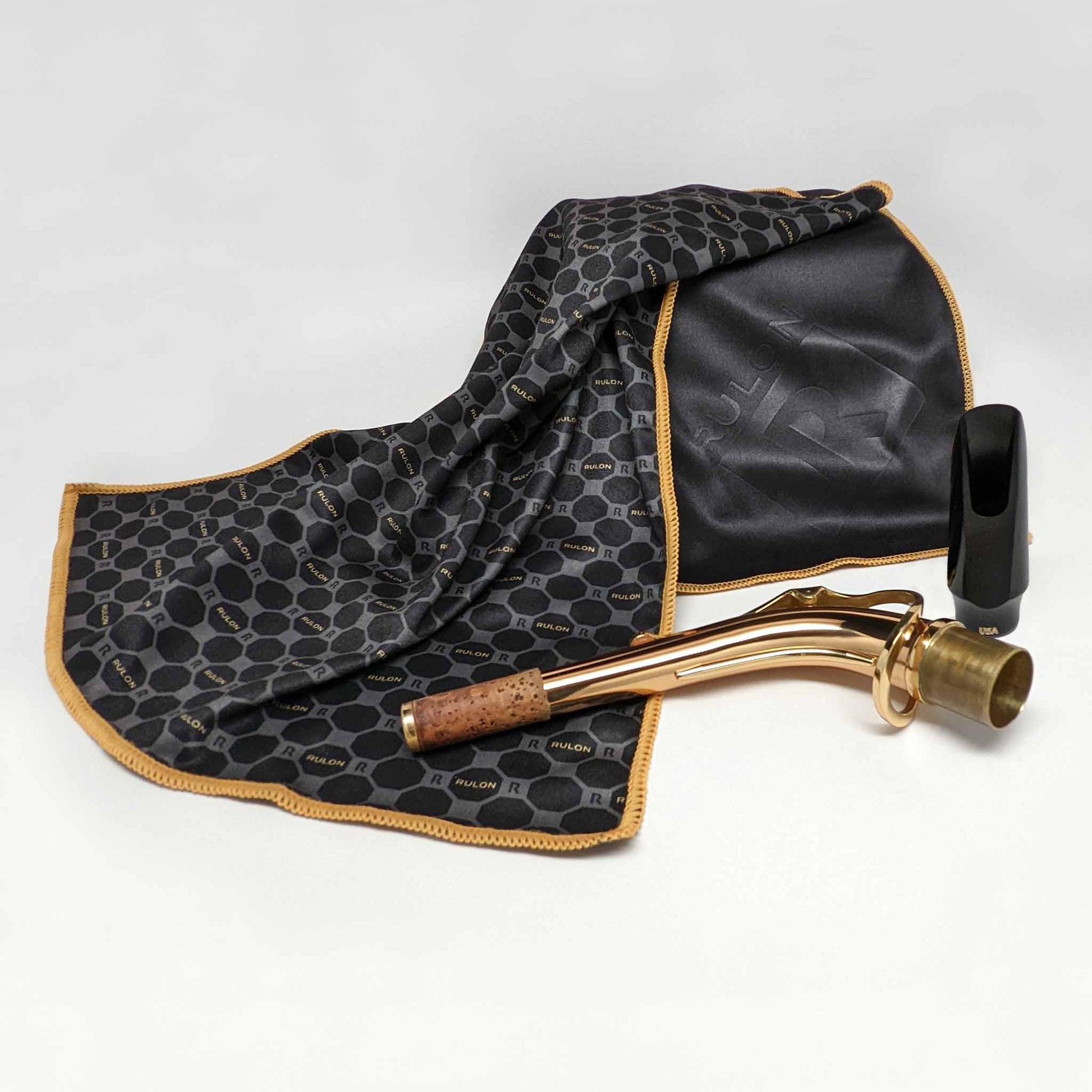 Look as good as you sound with this fashion print cleaning cloth for musical instruments designed by Rulon Brown. Sleek and modern, the cloth features gold edge sewing, a silvery black octagon pattern, and solid black back with elegant embossing. The ultra-soft fabric is safe for polishing all instrument finishes.